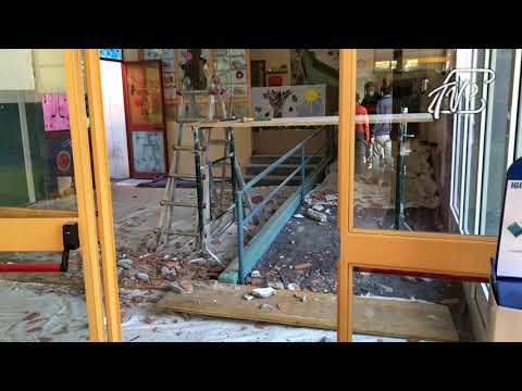 L’edificio ospita al piano terra mensa, palestra e asilo, al primo piano le elementari. Il controsoffitto caduto è parte dell’asilo “Gianni Rodari”.