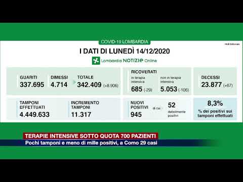 Terapie intensive sotto quota 700 e meno di mille nuovi positivi in Lombardia, anche se il dato risente come ogni lunedì del numero ridotto di tamponi processati. Confermato però il trend del tasso di positività, che si attesta all’8,3%, inferiore alla media nazionale, ed è un rapporto indipendente dalla quantità di test effettuata.