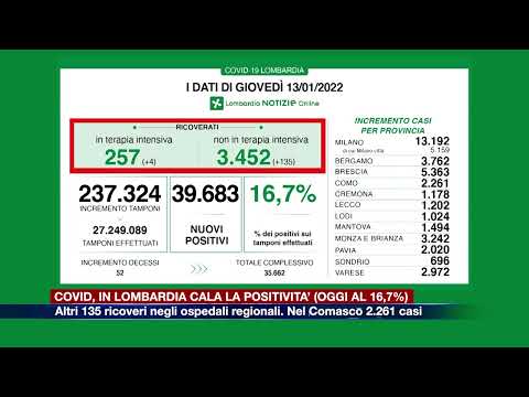 In Lombardia positività in calo nelle ultime 24 ore (si attesta al 16,7%). A fronte di 237.324 tamponi effettuati sono oggi 39.683 i nuovi casi registrati in Regione. 2.261 nel Comasco.